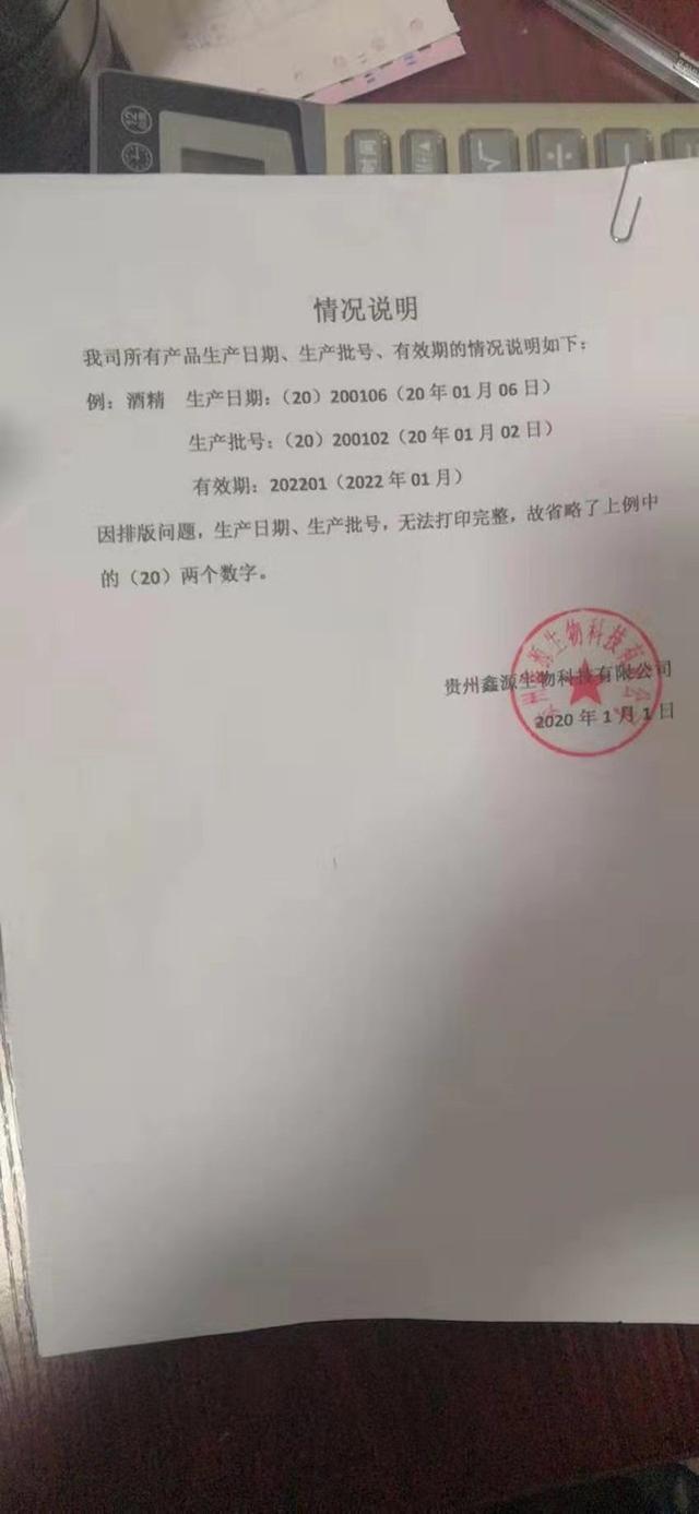 1月31日,記者在位于貴陽市都司路的一家藥店購買醫(yī)用酒精,每人限購兩瓶,100毫升/瓶,每瓶1.5元。當(dāng)天晚上,記者準(zhǔn)備使用酒精時發(fā)現(xiàn)生產(chǎn)日期有問題。于是記者查閱了貴州鑫源生物科技有限公司官網(wǎng)。官網(wǎng)顯示公司成立于2017年。帶著疑惑,記者于2月1日聯(lián)系上貴州鑫源生物科技有限公司董事長汪波,董事長給出了答復(fù):“因排版問題,生產(chǎn)日期、生產(chǎn)批號,無法打印完整,故省略了(20)兩個數(shù)字!